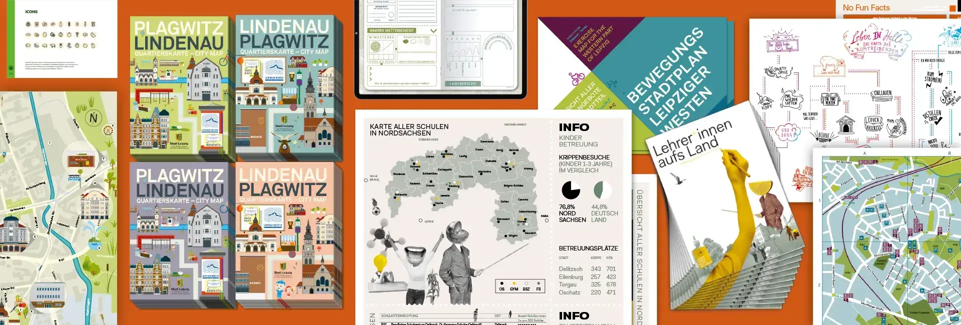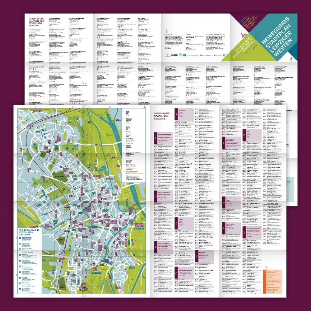 Für das Stadtteilbüro Leipziger Westen entstanden Stadtpläne, die neben der Orientierung auch das Leben im Quartier durch detailreiche Illustrationen und „Häuserportraits“ sichtbar machen. Der Bewegungsplan der Stadt Leipzig zeigt Sportangebote im Leipziger Westen, gegliedert durch eigens entwickelte Piktogramme.