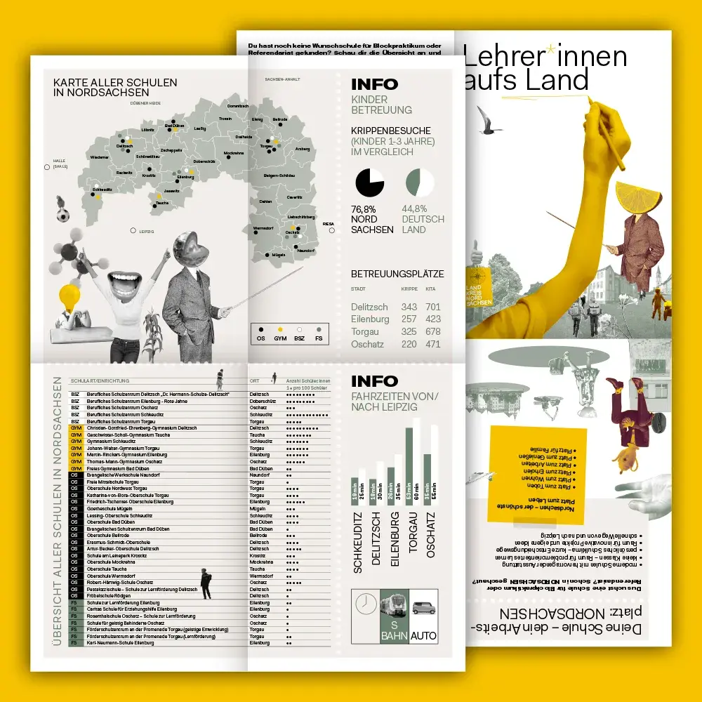 Auch die grafische Aufbereitung von Projekten wie „Lehrer*innen aufs Land“ – mit humorvollen Collage-Elementen – oder die Entwicklung von Keyvisuals und digitalen Checklisten für KreativLandTransfer zeigen die Vielfalt unserer Ansätze: immer angepasst an Inhalt, Zielgruppe und Medium.