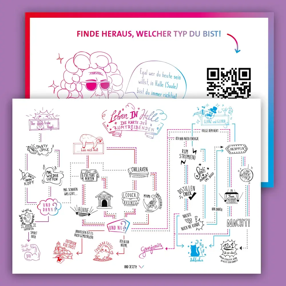 Für das Stadtmarketing Halle wurde ein illustrierter Entscheidungsbaum – die „Karte der Rumtreibenden“ – umgesetzt, bei dem jedes Icon individuell entwickelt und vektorisiert wurde. Entstanden sind eine Postkarte sowie eine interaktive PWA zum Durchklicken.