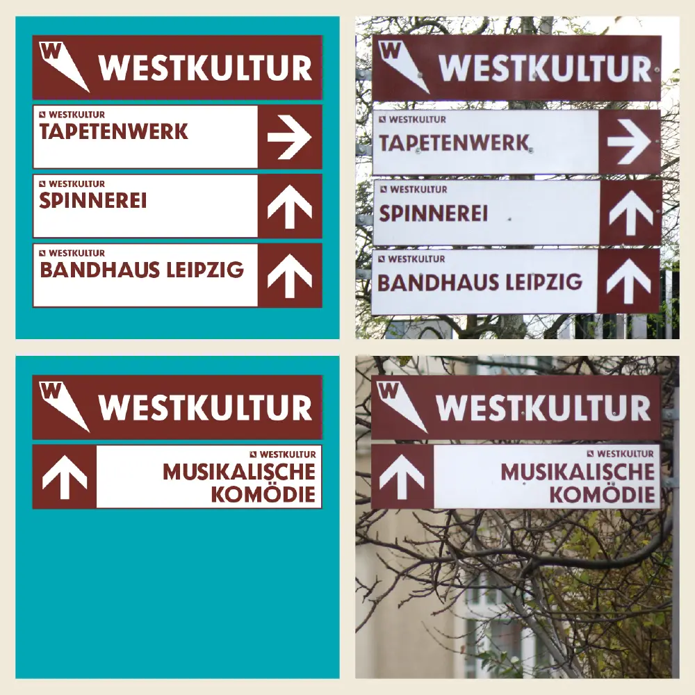 Im Auftrag der Stadt Leipzig entstanden integrierte Steintafeln zu den Partnerstädten auf dem Rathausvorplatz sowie das Kulturleitsystem „Westkultur“ mit passenden Wegweisern und Logo für den Leipziger Westen.