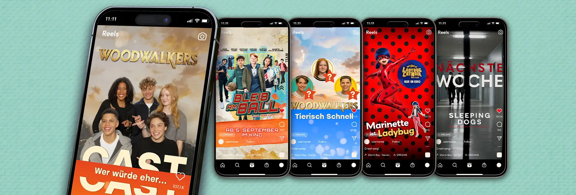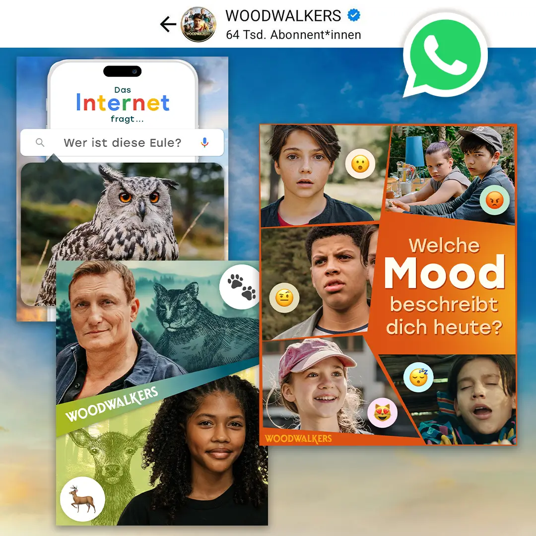 Je nach Bedarf entwickeln wir vollständige Social Media-Kampagnen oder unterstützen punktuell mit passgenauen Creatives. Für Woodwalkers entstand eine umfangreiche Kampagne mit statischen und animierten Inhalten, abgestimmt auf verschiedene Plattformen und Zielgruppen – vom Countdown bis zum Kinostart, vom Trailer Snippet bis zur Story-Umfrage.